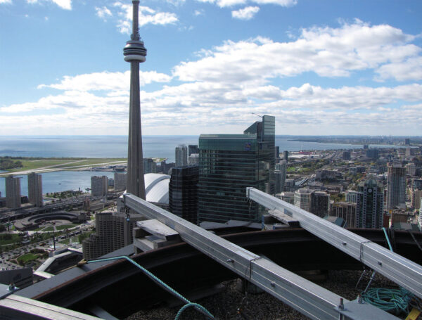 Beam dollies feature two-pieces galvanized steel construction and pivotal 10” flat free locking wheels that roll easily, allowing workers to move an outrigger beam system along the edge of the roof. Adjustable height provides up to 48” roof clearance.