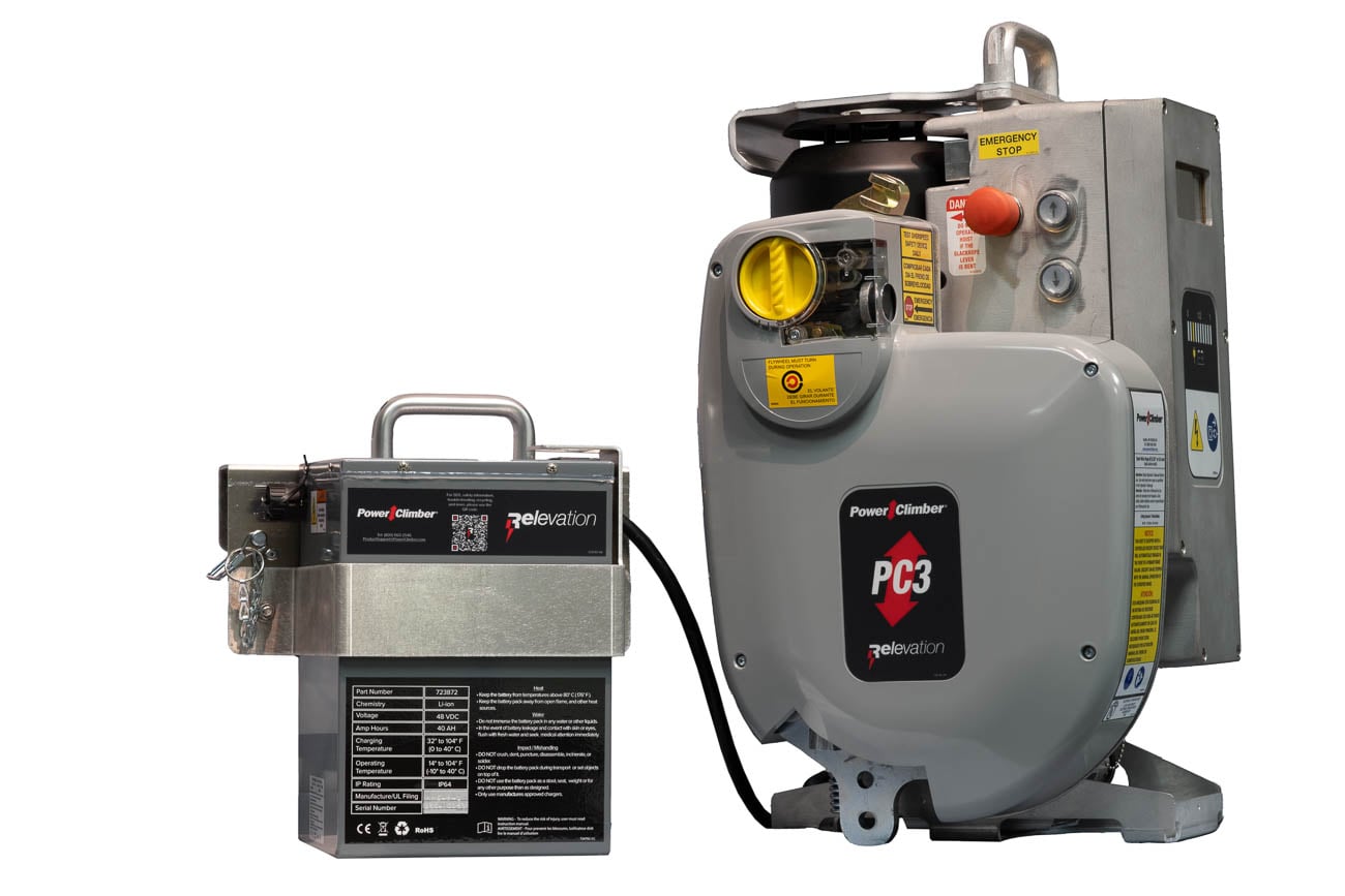 Power Climber’s PC3 Relevation hoist is the only battery-powered traction hoist on the market. With a 1000 lb capacity and personnel rating, the PC3 Relevation lets you work at elevation safely, reliably, anywhere you need it.